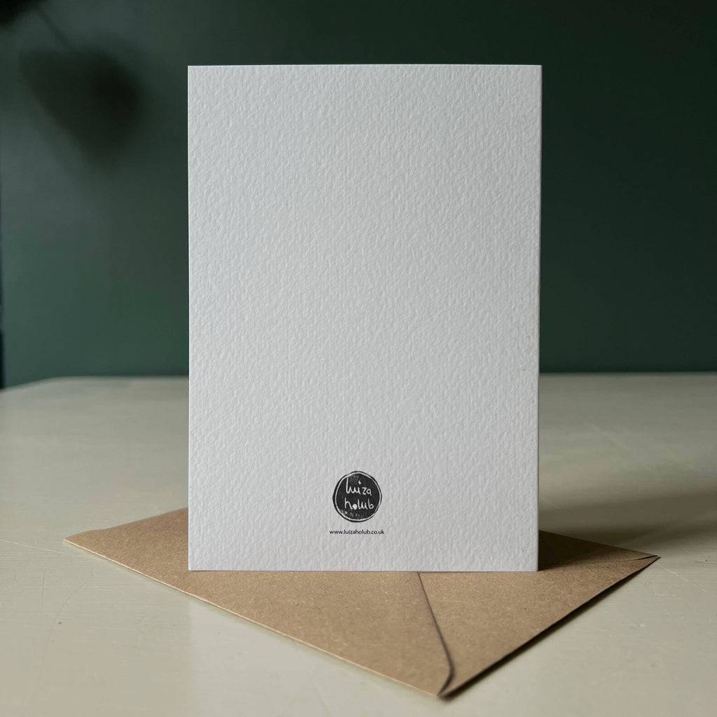 This card is a professional digital print of an original linocut print designed by Luiza Holub. Made in the UK. Blank inside for your own message. Kraft envelope included