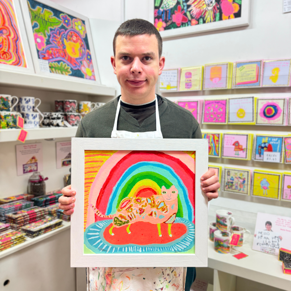 Made in the UK with responsibly sourced single origin cocoa, wrapped in coloured foil & encased in a recyclable envelope that features Stephen Knapman’s bright and beautiful Rainbow Cat artwork. ARTHOUSE Unlimited is a Charity that presents artwork created by adults with complex Neurodiverse & physical support needs in supported studio sessions. All work derives from the skills each artist brings & every contribution holds real value. 100% of sales goes back into sustaining the Charity.