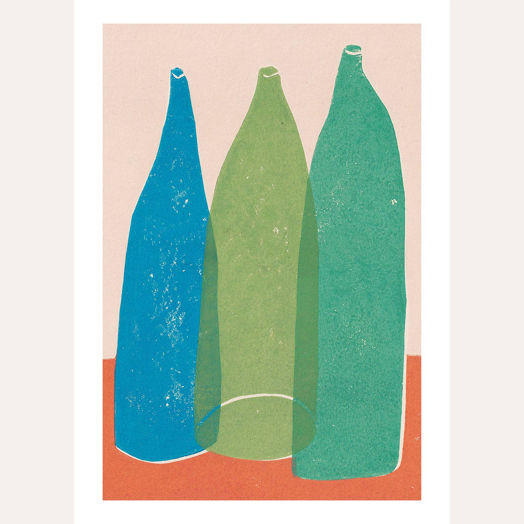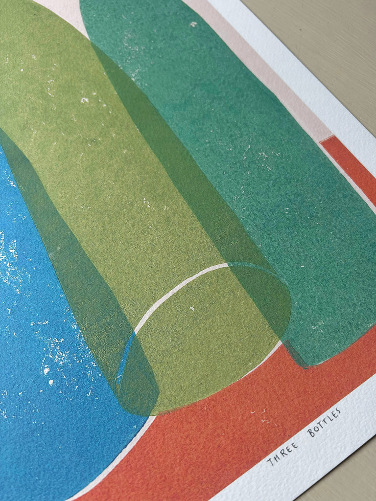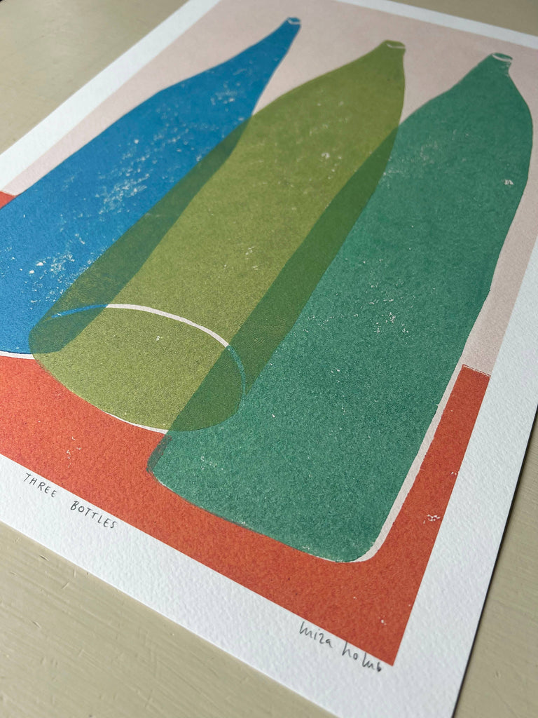 Three Bottles is a digital reproduction of an original, hand printed linocut piece