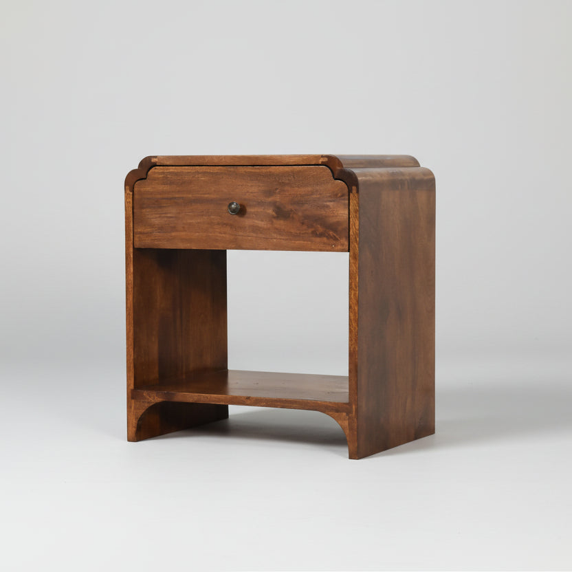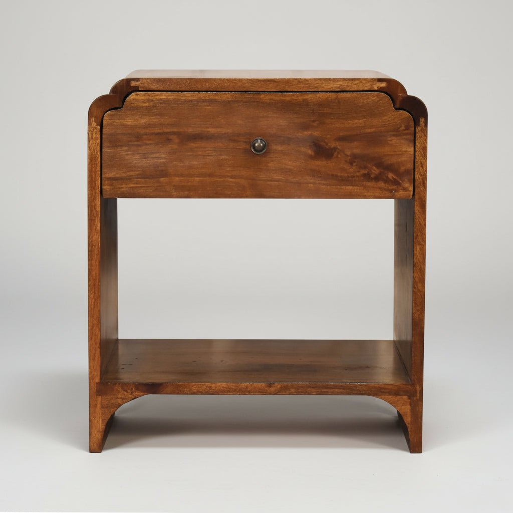 The Greta bedside table in Chestnut, brings refined elegance to your bedroom. Its rich walnut finish and distinctive scalloped edging create a sophisticated focal point, while solid construction guarantees enduring quality. This thoughtfully designed furniture piece balances aesthetic refinement with practical storage, offering a timeless addition to curated interiors that value both craftsmanship and longevity. Hand crafted by highly skilled Artisans in India from sustainable Mango Wood.