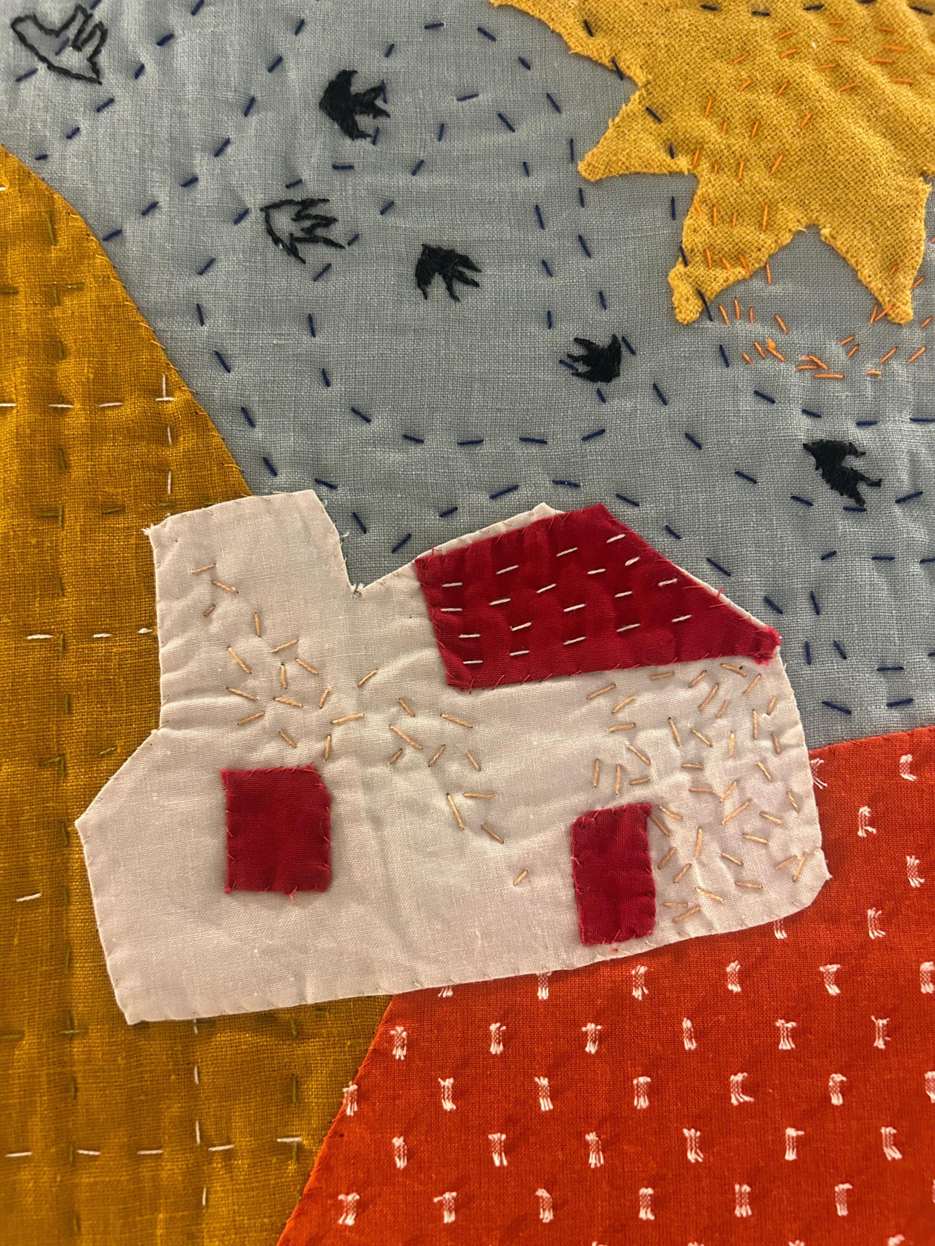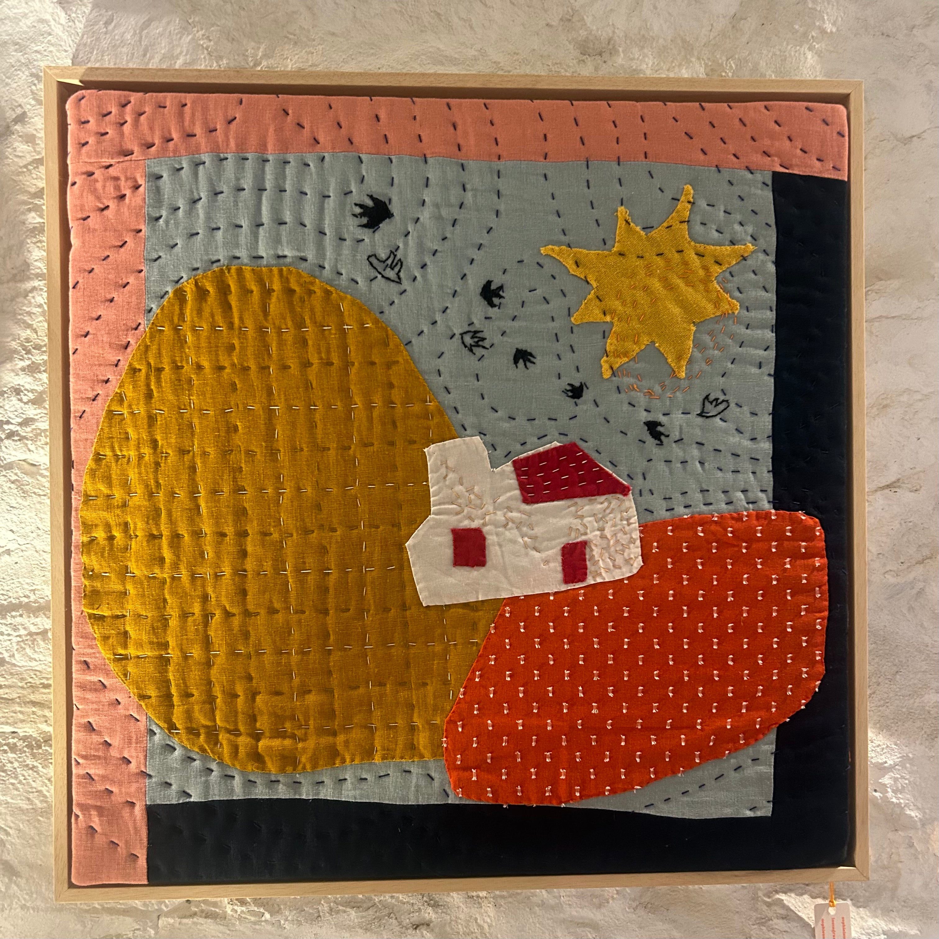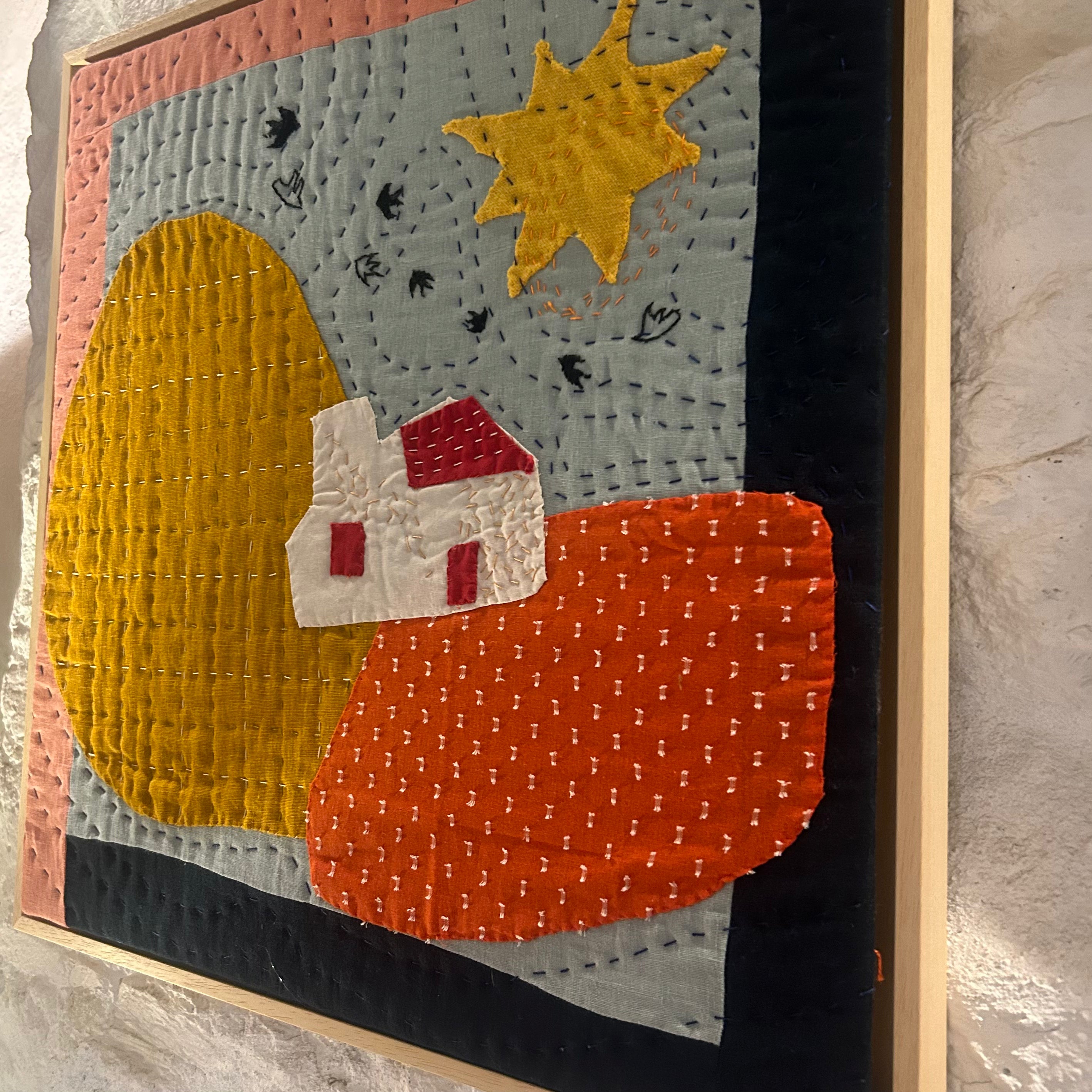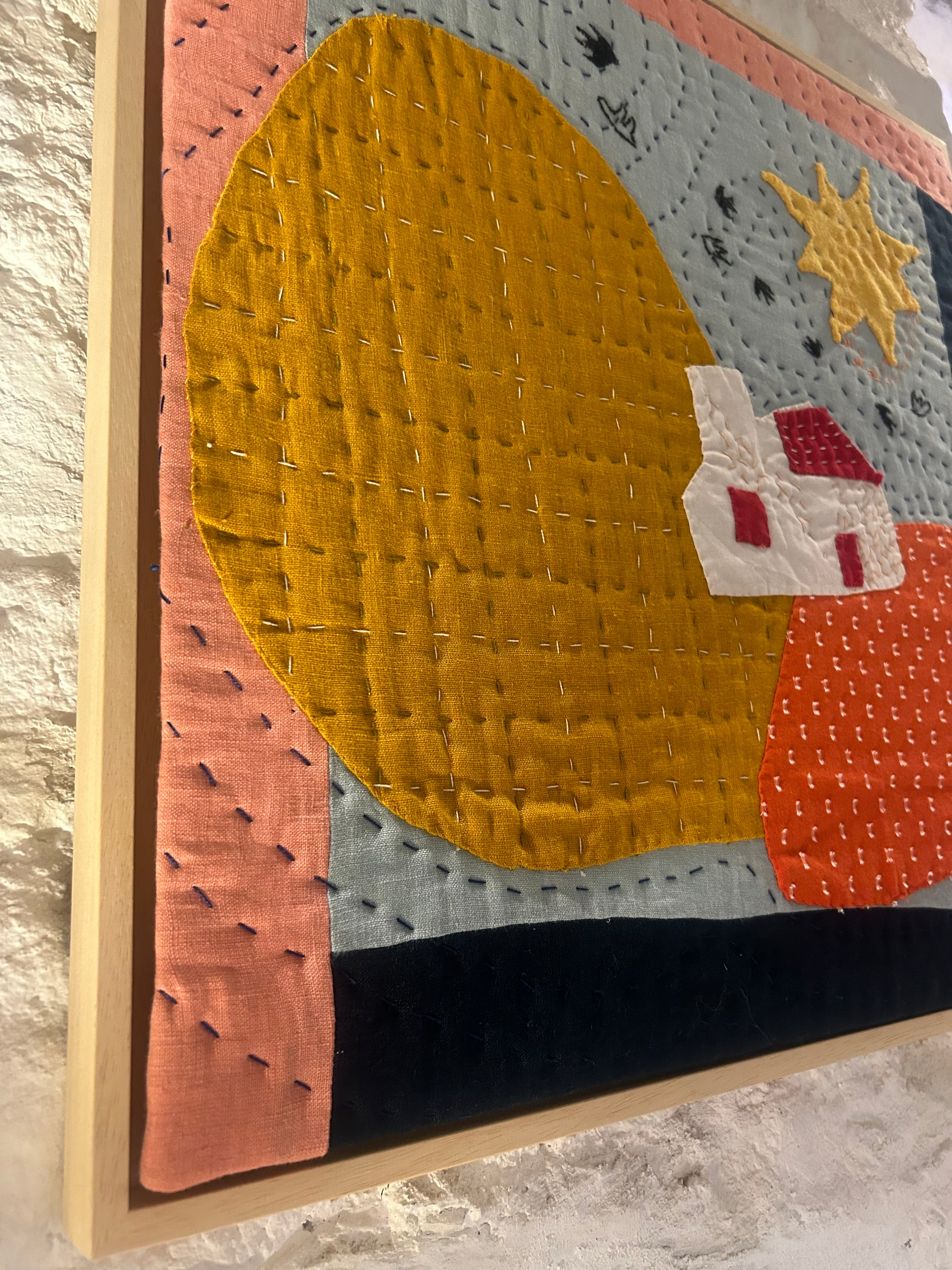 This is a one off hand stitched quilted and appliqued artwork piece mounted inside of a wooden floating frame.
