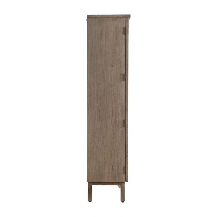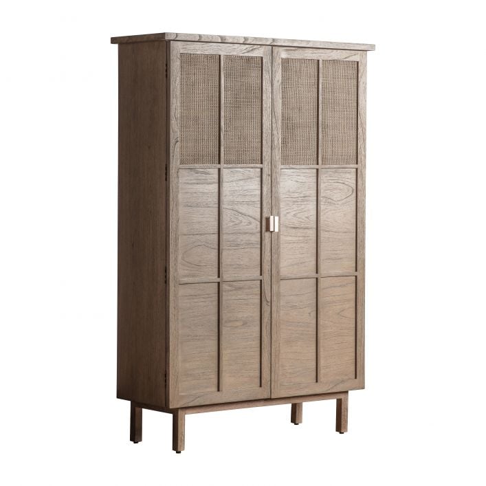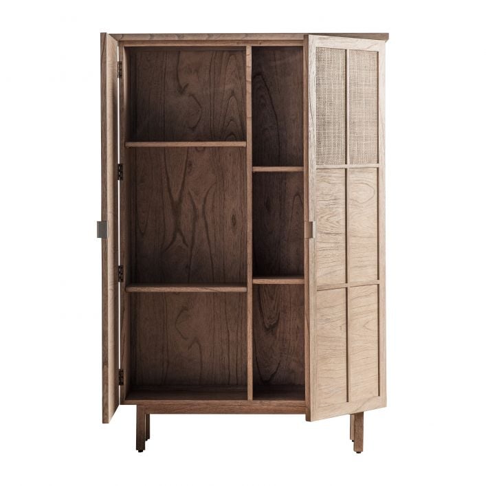 Mae gan y cwpwrdd storio chwaethus hwn bedair silff fewnol y gellir eu haddasu sy'n creu chwe lle storio. Mae gan y ddau ddrws fanylion estyll modern gyda mewnosodiadau rattan ffon wedi'u gwehyddu â llaw i'r rhan uchaf a dolenni efydd wedi'u brwsio. Wedi'i saernïo o bren ac argaenau onn solet gyda gorffeniad traddodiadol ysgafn.