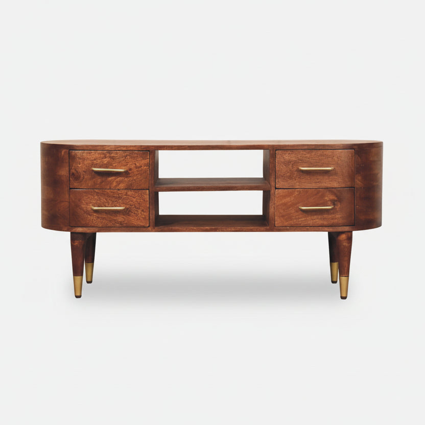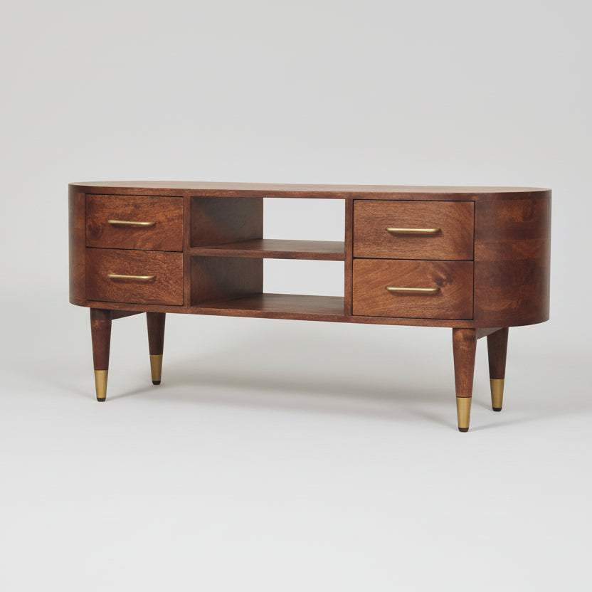 The Anno Media Unit in Winewood Oak, represents a masterclass in restrained elegance, meticulously fashioned from solid mango wood with gracefully curved edges and slender tapered supports. Four drawers provide concealed storage whilst preserving the piece's inherently light, sculptural quality. The rich finish accentuates the wood's natural character, whilst brass detailing introduces understated refinement without visual excess. The dual open shelves are ideal for displaying your favourite media devices or collectibles, adding a personalised touch. This media unit delivers sophisticated presence to contemporary and mid-century interiors, embodying both functional intelligence and enduring design integrity.